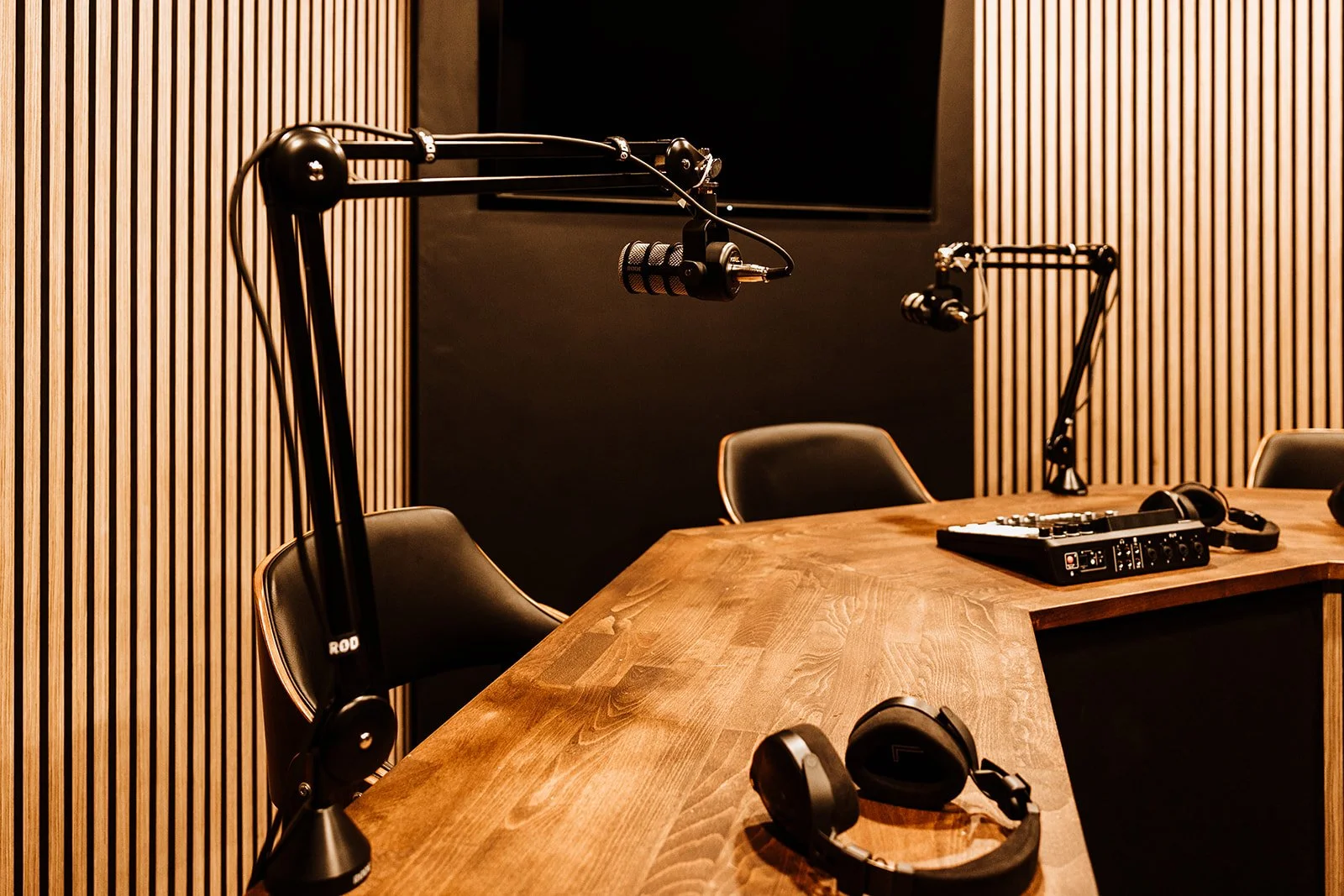 Purpose-built podcasting room designed to elevate your podcast content creation, Featuring premium microphones and studio-grade mixers,