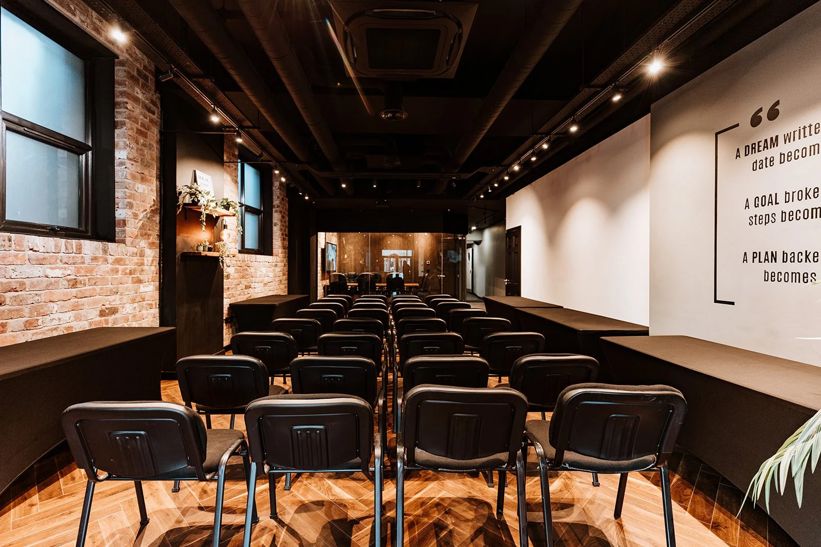 A spacious conference room designed to host up to 60 attendees, making it an excellent choice for meetings and presentations